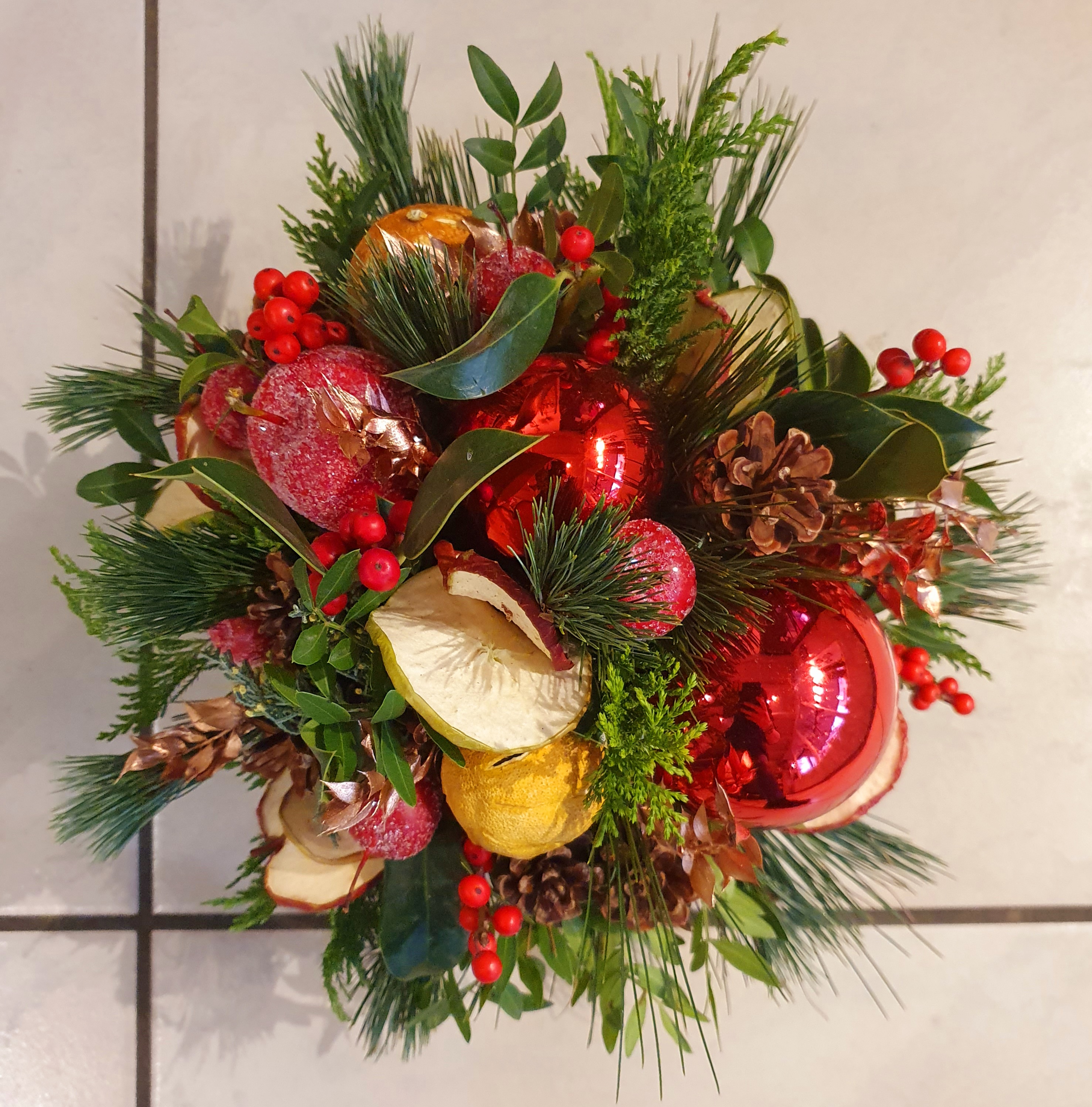 Bouquet rond coloré et chaleureux composé d’éléments naturels et de décorations de Noël . Une composition festive et dynamique