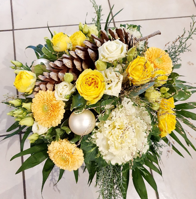 Bouquet rond dans des teintes pétillantes de jaune et de blanc. Le tout agrémenté de jolis éléments de Noël pour un bouquet festif et scintillant.