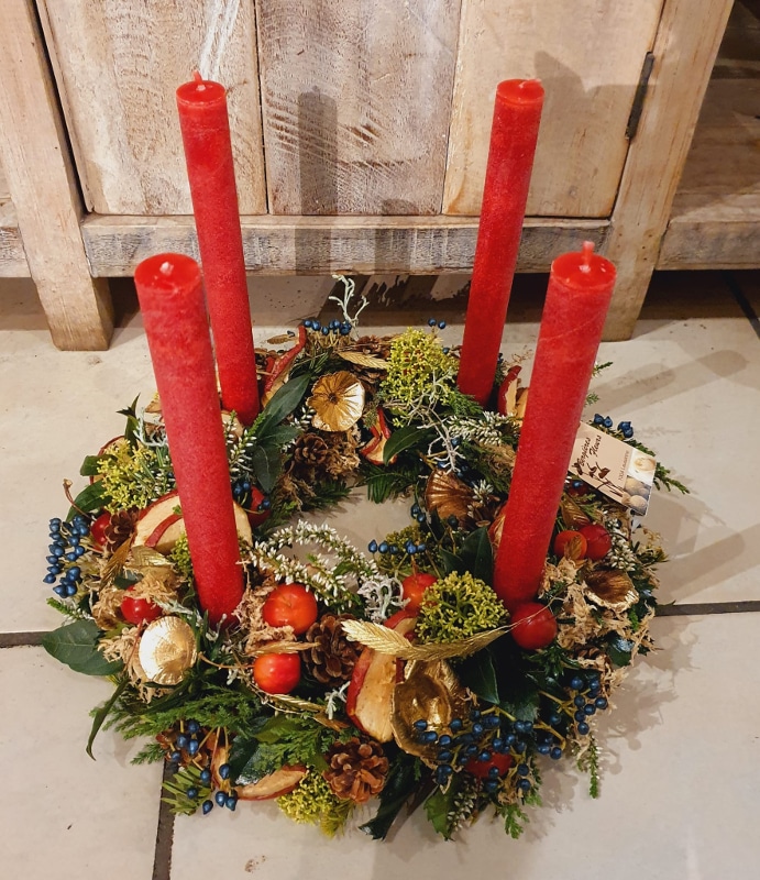 Couronnes de l’Avent sur fond en biolite, elles sont préparées uniquement avec des éléments naturels et comportent 4 bougies fuseaux pour les 4 dimanches de l’Avent.