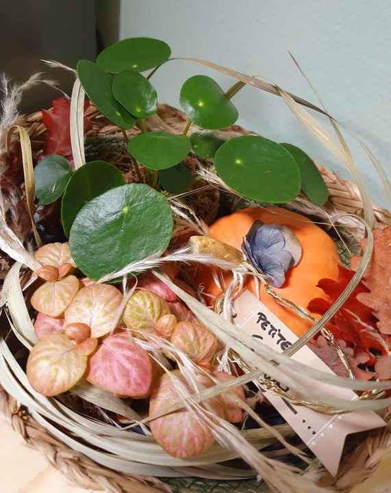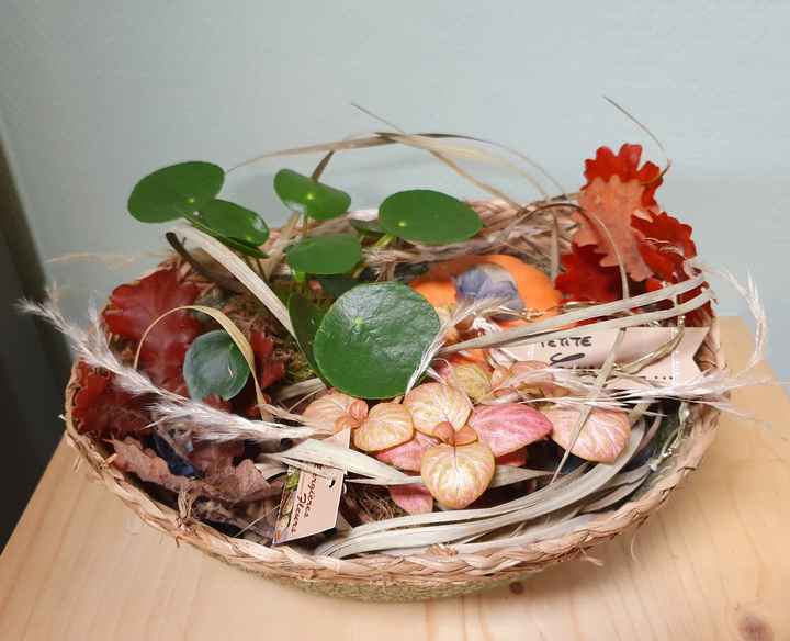 Plantation de plantes pour l’intérieur avec une décoration automnale et chaleureuse. Cette terrine est composée de différentes plantes d’intérieur et de divers éléments naturels tel que mini coloquintes, feuillage d’automne, branchages, marrons, physalis séchés etc…